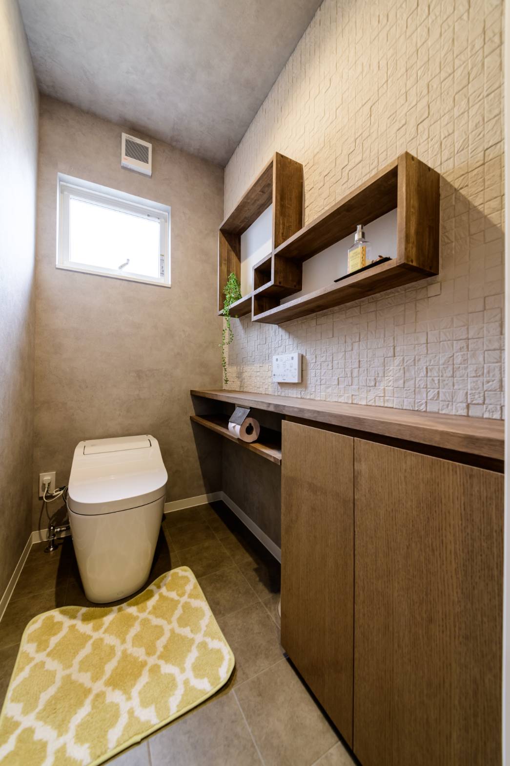 壁はエコカラットを採用して造作で棚と収納を作りました。家の全体は明るい雰囲気で内装は揃えましたがトイレだけはかっこよく長くいても落ち着ける雰囲気にしました。個人的にはとても満足しています。こだわって考えるときれいに保ちたくて進んで掃除もできます。