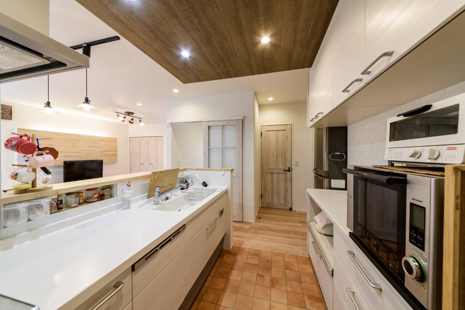 キッチンは天井を折り下げて床もフ掃除しやすいフロアタイルにしました。カウンターを少しだけ高くして作ったスパイスラックは重宝してます。画像には映っていないですがキッチンの奥にはパントリー部屋をつくりました。我が家は共働きなのでストックをまとめ買いするのでパントリーがあるとありがたいです。