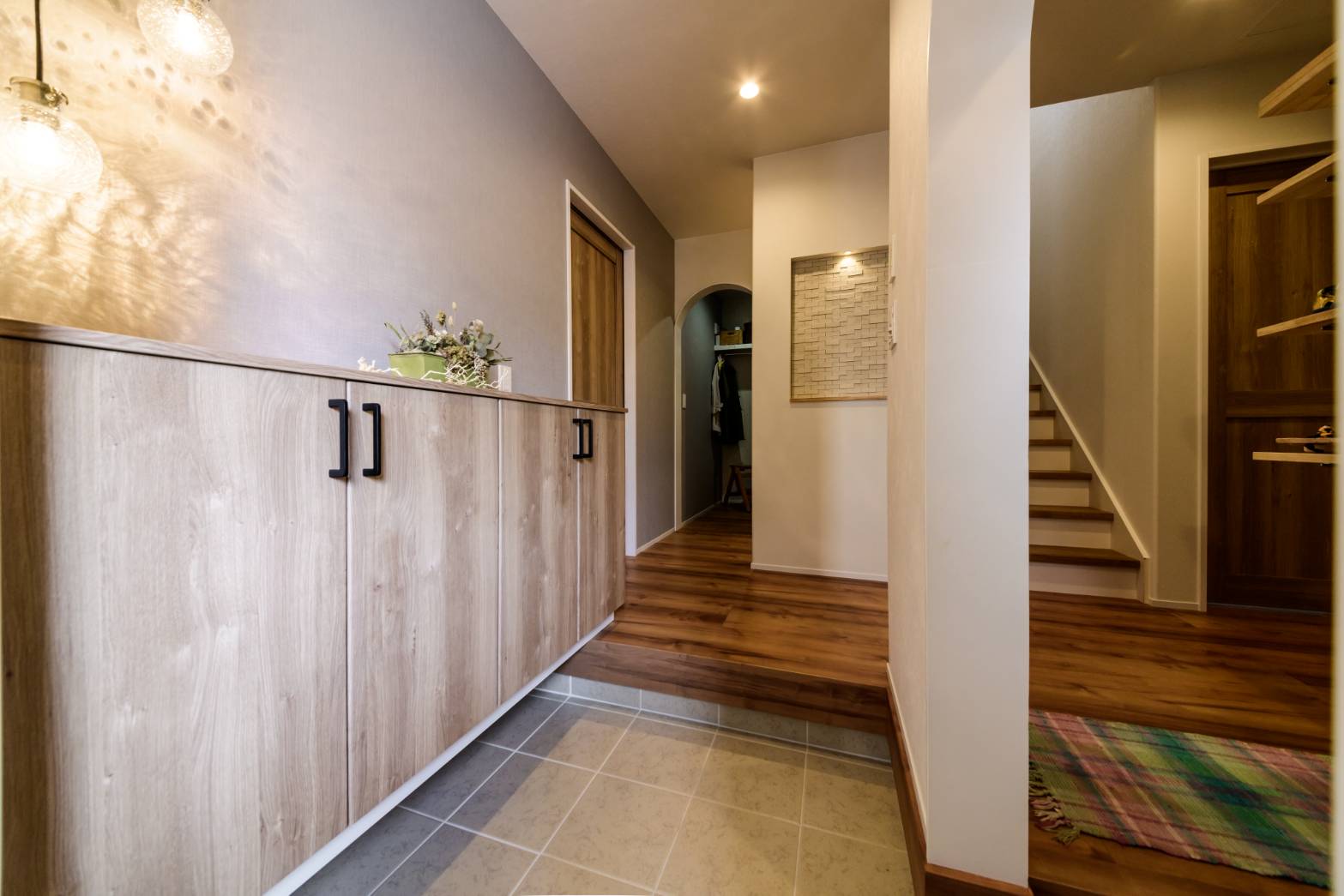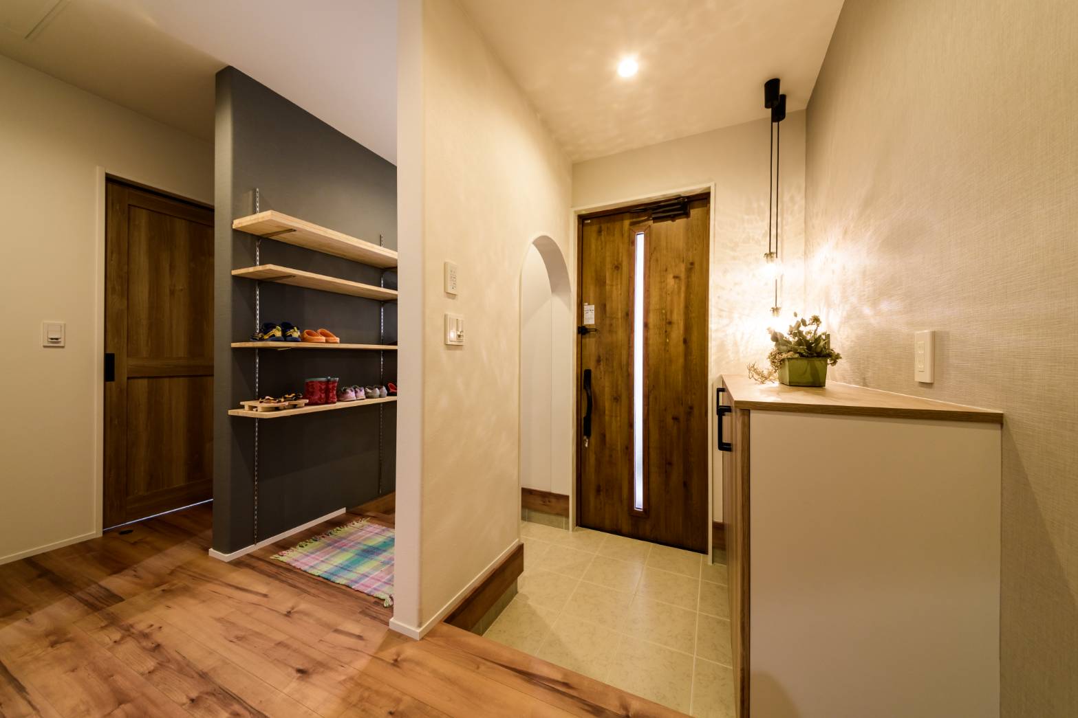最後に紹介するのは玄関です。玄関は2WAYで使えるようにしてシューズクロークと正面に分岐しています。玄関の下駄箱は浮かせて作りつけたので下駄箱の下に娘のキックボードなどもしまい込めるようにしました。また、ペンダントライトを長めにして吊り下げて壁で乱反射するように照明をつけました。