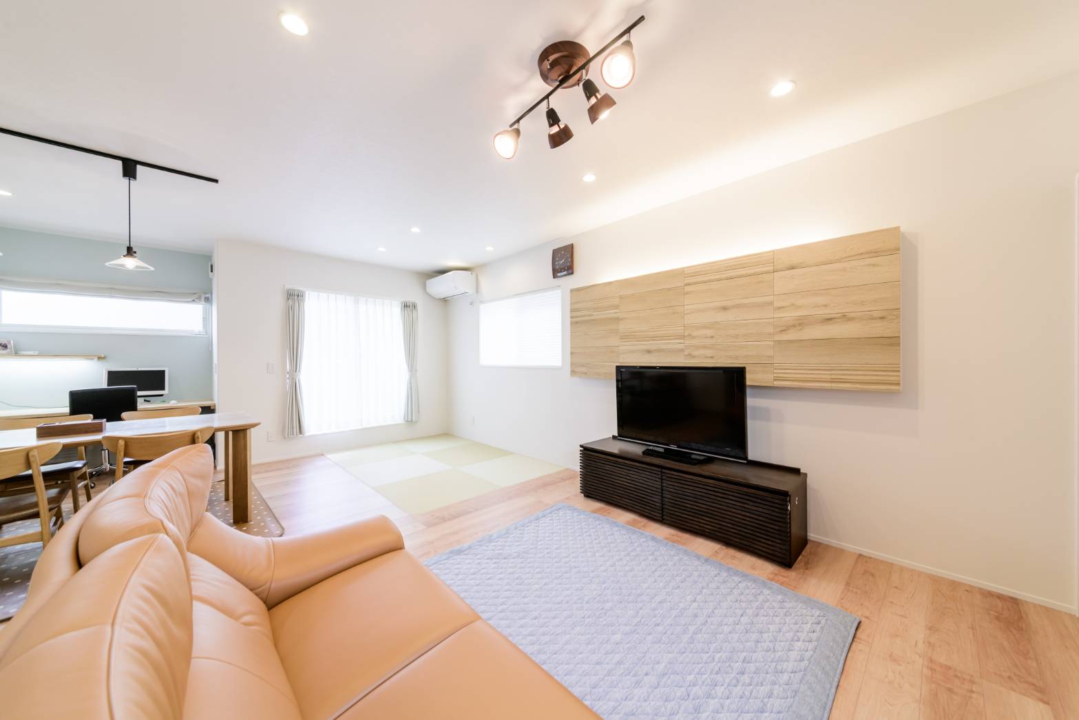 リビングにも造作でエコカラットの壁を制作して間接照明を埋め込みました。また、リビングにフラットのタタミコーナーと書斎コーナーを作りました。我が家は目の前が交通量も人通りも多い立地なので2FにLDKと水回りを作っています。