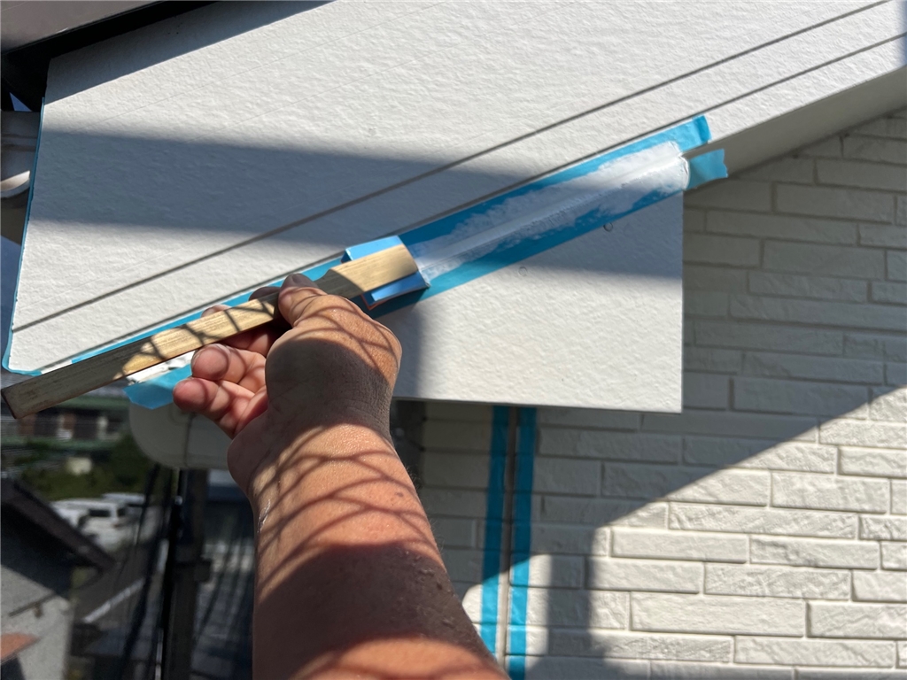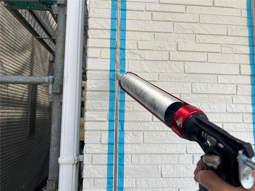 マスキングテープでしっかり養生し、はみ出しのないよう丁寧にシーリング材を充填しています。見た目の美しさはもちろん、防水性・耐久性を高める大切な工程となります。