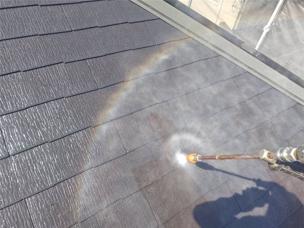 屋根の凹凸や細部も見逃さず、隅々まで高圧洗浄できれいに仕上げています。この工程が、後の塗装の品質を左右する重要な作業となります。