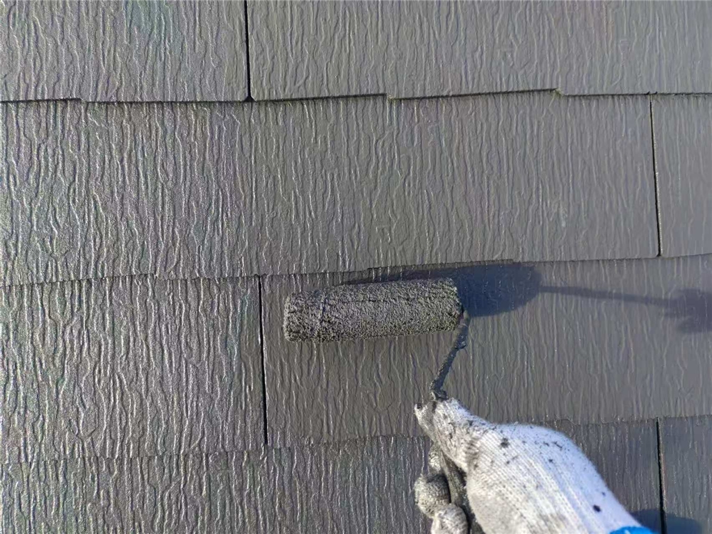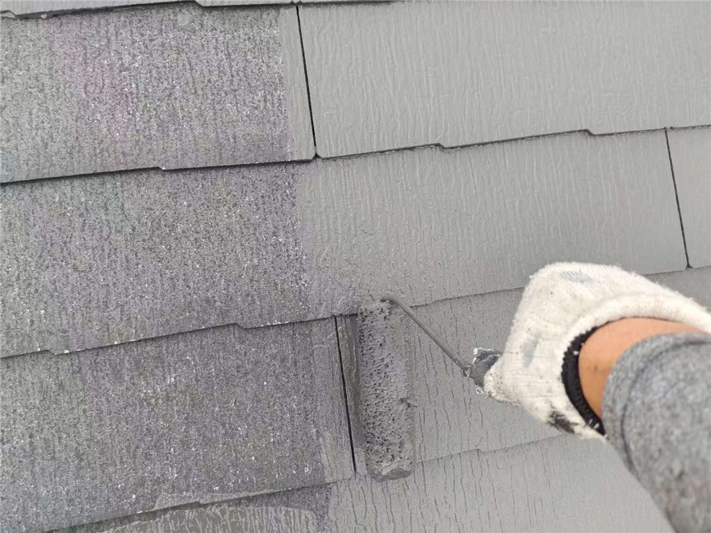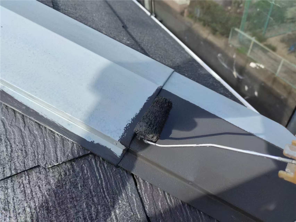 屋根の平面だけでなく、棟や谷などの板金箇所も丁寧に塗装を行なっていきます。