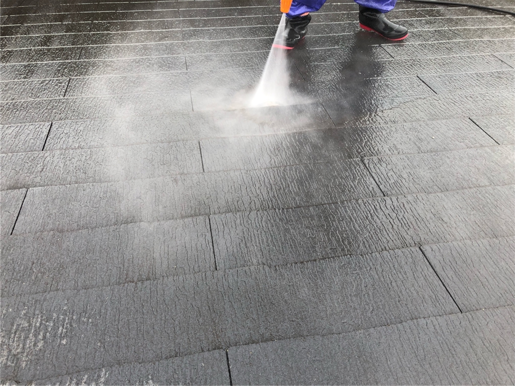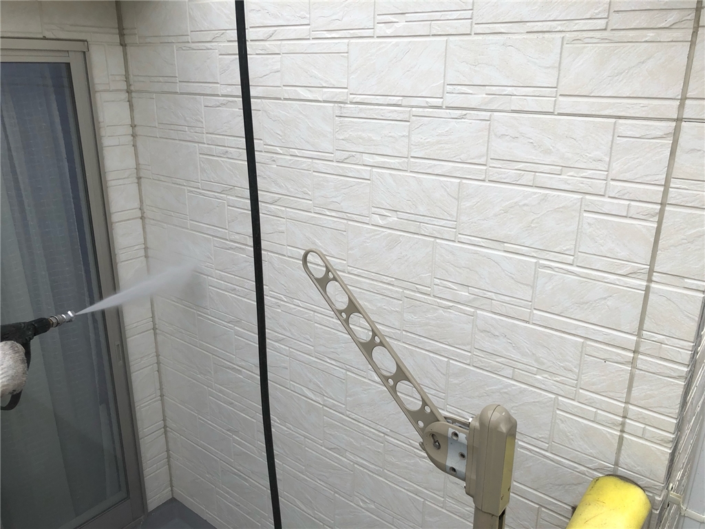 バルコニーは日々の汚れや苔が溜まりやすい場所です。高圧洗浄でしっかりと汚れを落とし、清潔で滑らかな下地を整えました。