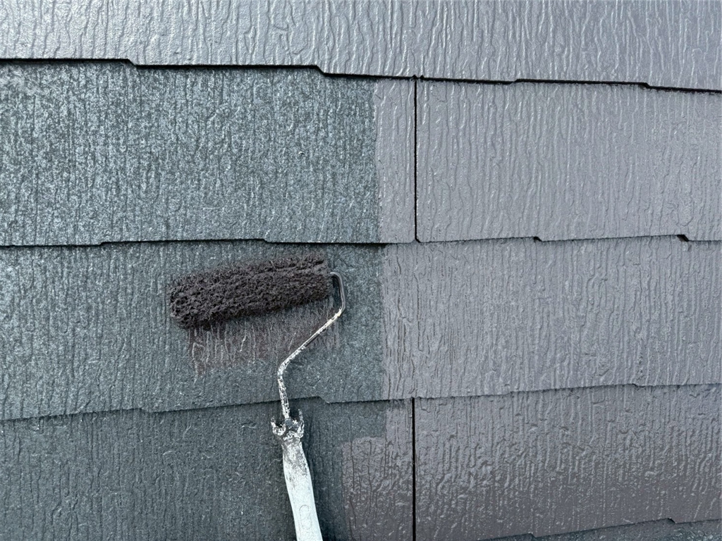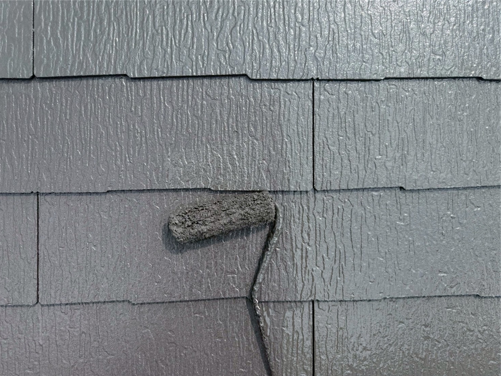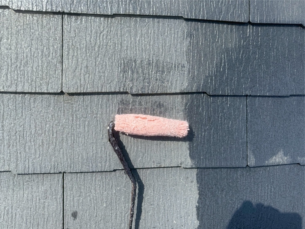 屋根材の隅々まで塗布し、雨風から建物を守る仕上げ作業中です。