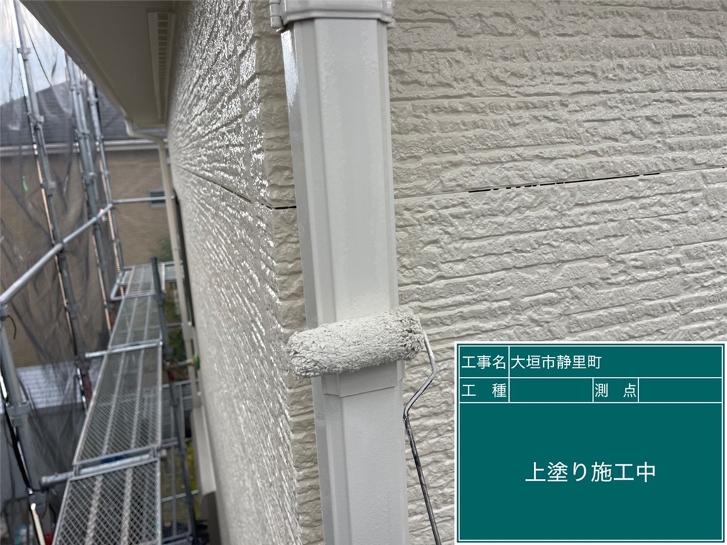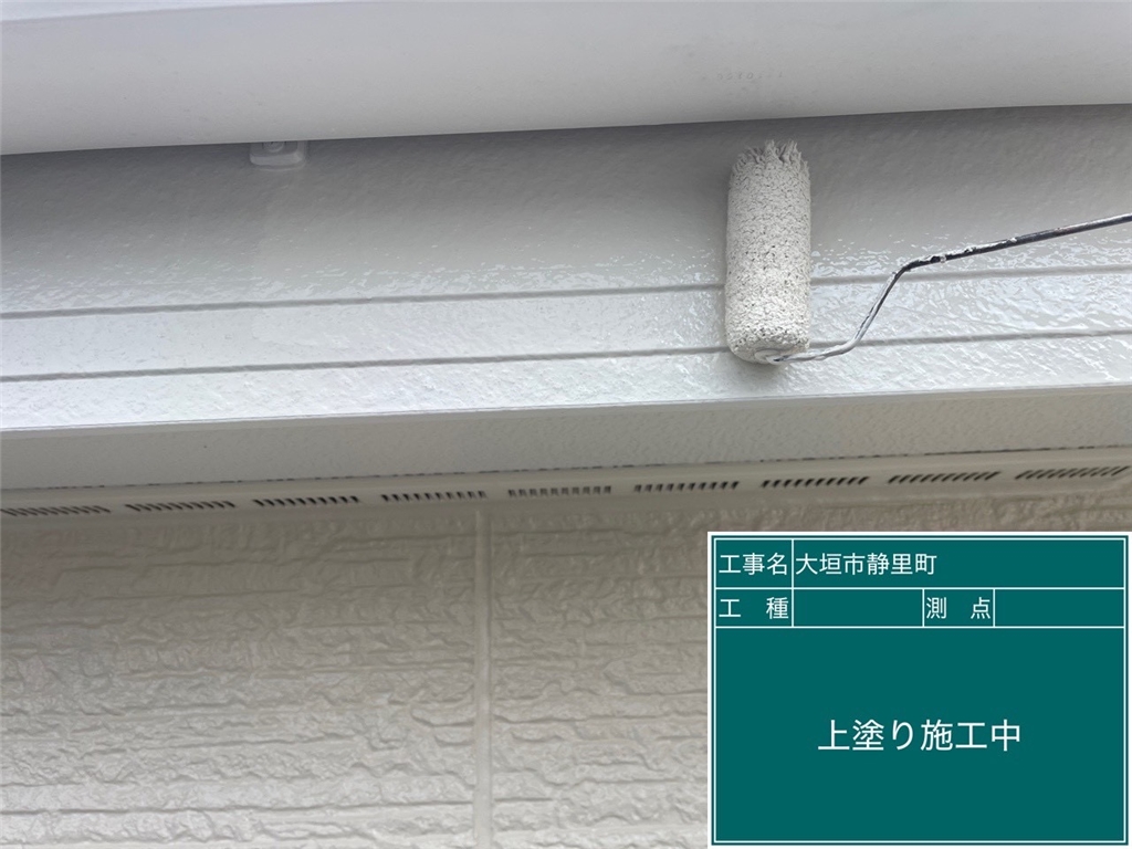 雨樋や軒天、シャッターボックスなどの付帯部も一切妥協しません。 細かい部分は刷毛、広い面はローラーを使い分け、鏡面のような美しいツヤを出していきます。お写真の通り、ライン一つひとつがシャープに仕上がることで、家全体に「高級感」と「清潔感」が宿ります。