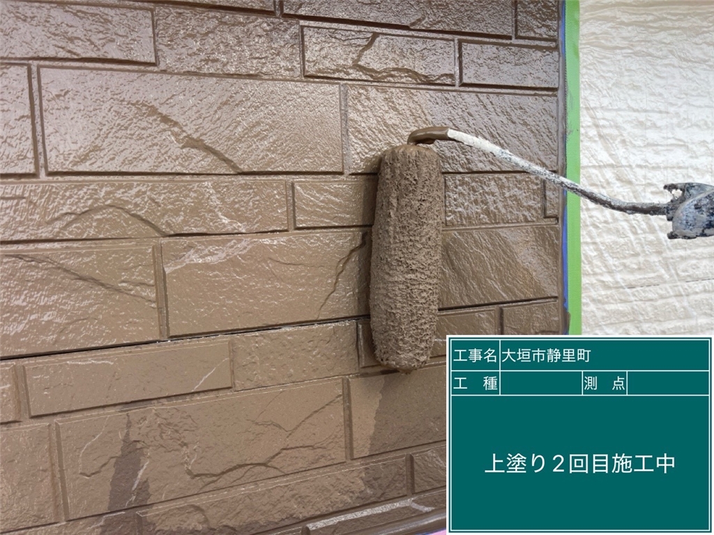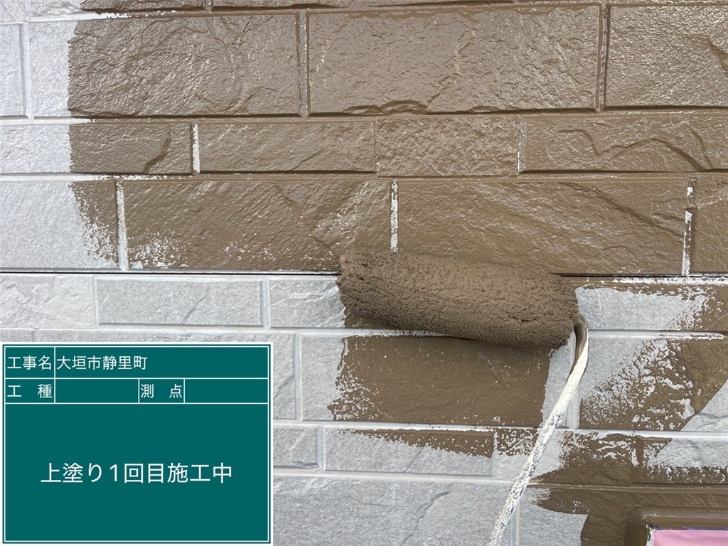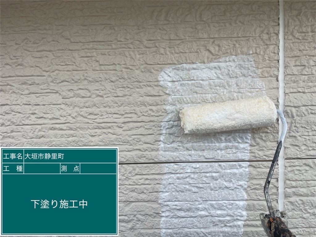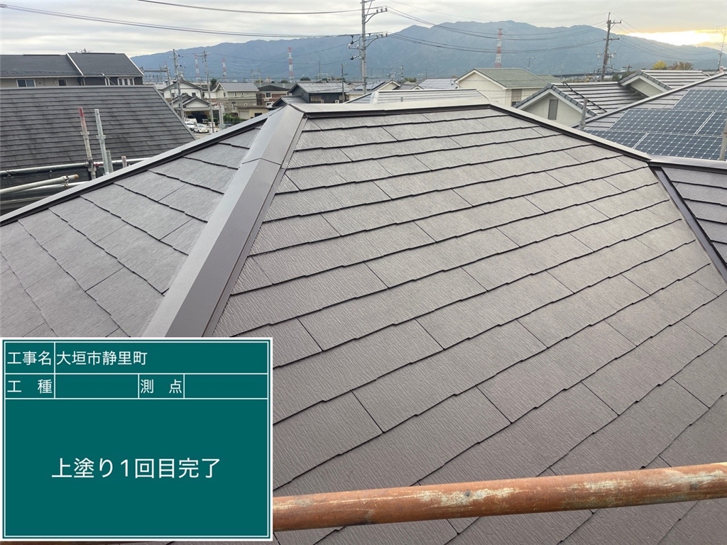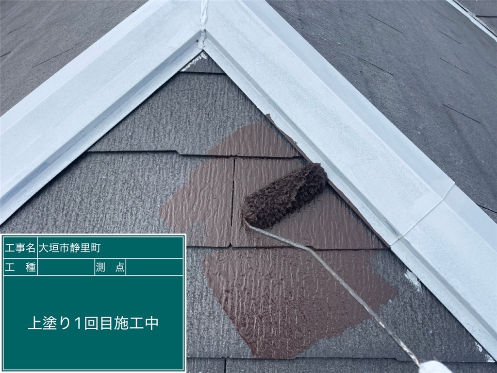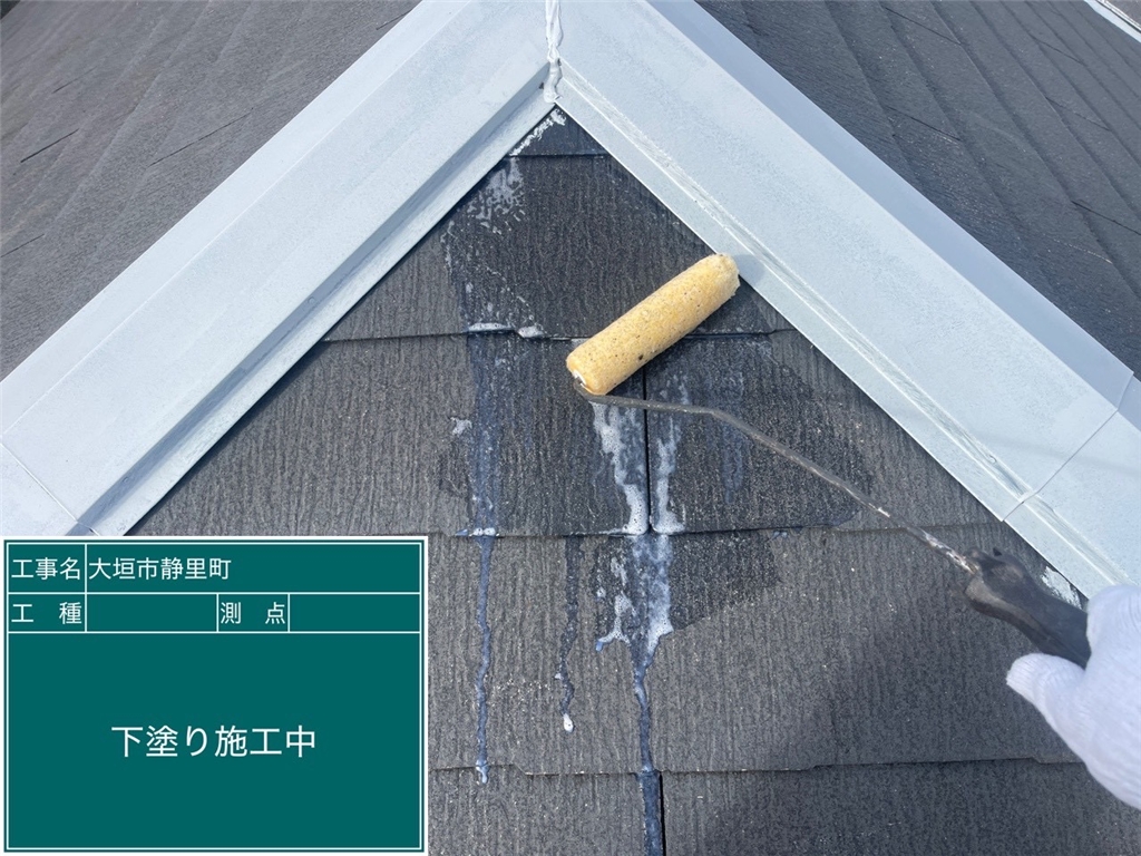 経年で傷んだ屋根材(スレート)に、高品質な下塗り材をたっぷりと浸透させました。これにより、屋根材そのものを補強し、次に塗る上塗り塗料との「最強の絆(密着力)」を作り出します。中塗り・上塗りと工程を重ねることで、肉厚で強靭な塗膜を形成します。お写真のようなツヤのある滑らかな仕上がりは、高い防水性能の証です。